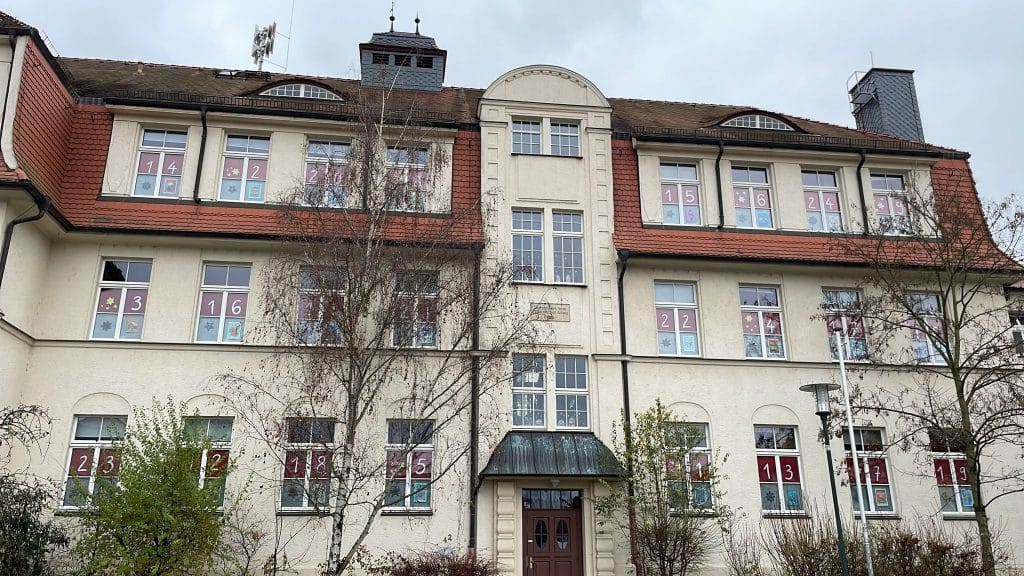 Fensterkalender der Schule leuchtet in der Vorweihnachtszeit