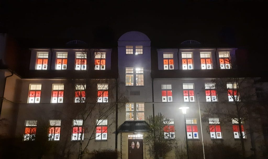 Fensterkalender der Schule leuchtet in der Vorweihnachtszeit